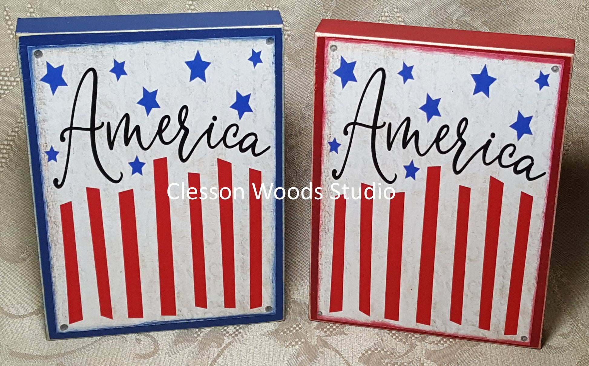 America Flag Patriotic small wood block sign comes in two sizes. Small is 4” x 5.5” and Large is 5.5” x 7.5”. I start with ¾” thick premium pine that I cut to size. I use high quality satin finish paint for exceptional results. The printed image is permanently applied to the painted surface. I shade around the image with matching paint to blend the image into the block for a quality décor piece you will be proud to display or give as a gift. The edges are sanded for a slightly worn look. With two sizes available these are great décor pieces for tiered trays, counter, shelf, table or desk.