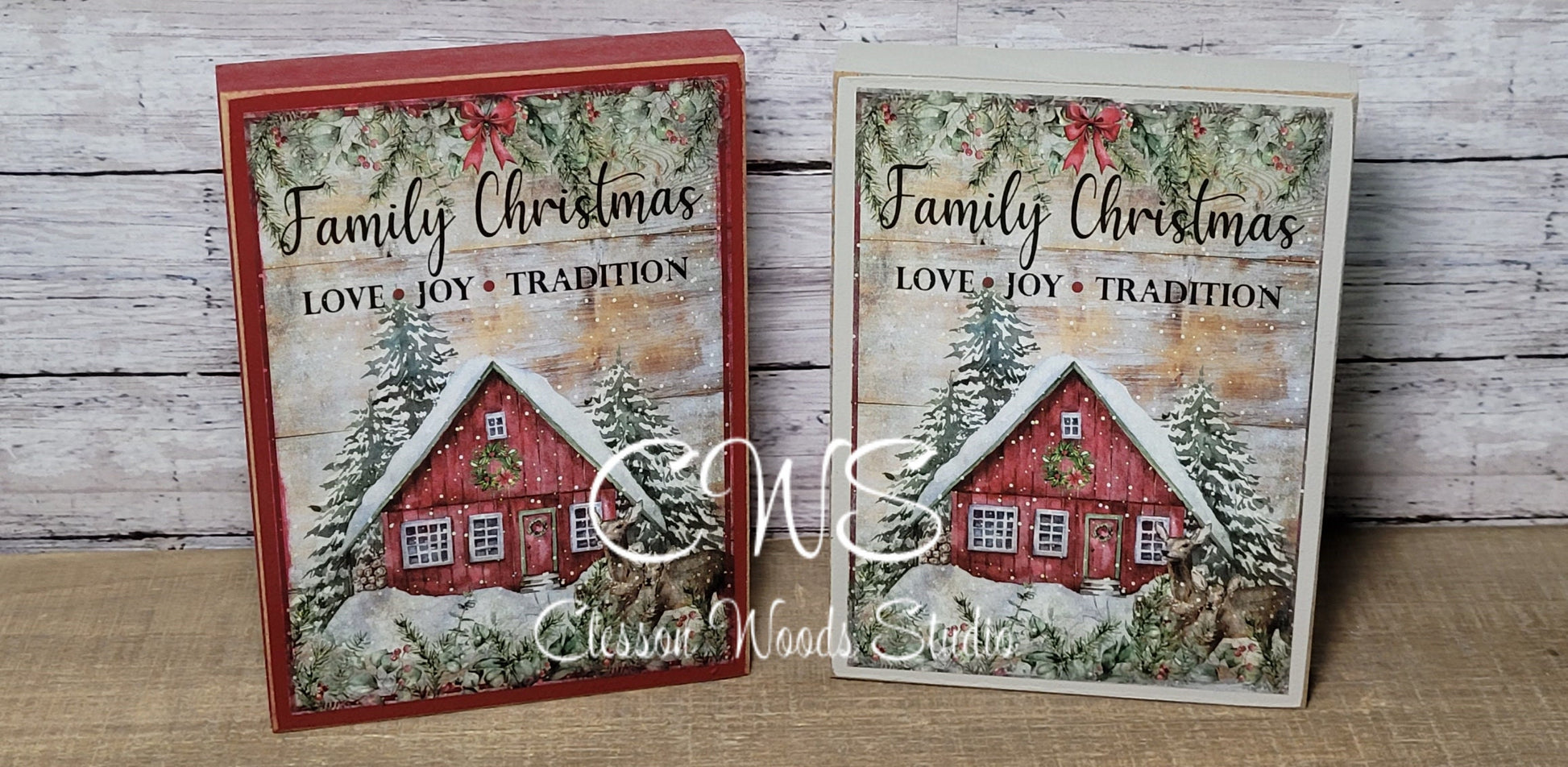 Family Christmas Love Joy Tradition Wood Sign comes in two sizes. Small is 4” x 5.5” and Large is 5.5” x 7.5” and both are ¾” thick. I use high quality satin finish paint for exceptional results. The printed image is printed on specialty adhesive paper and permanently applied to the painted surface. I shade around the image with matching paint to blend the image into the block for a quality décor piece you will be proud to display or give as a gift. The edges are sanded for a slightly worn look. With two sizes available these are great décor pieces for tiered trays, counter, shelf, table or desk. Not suitable for outdoor use.