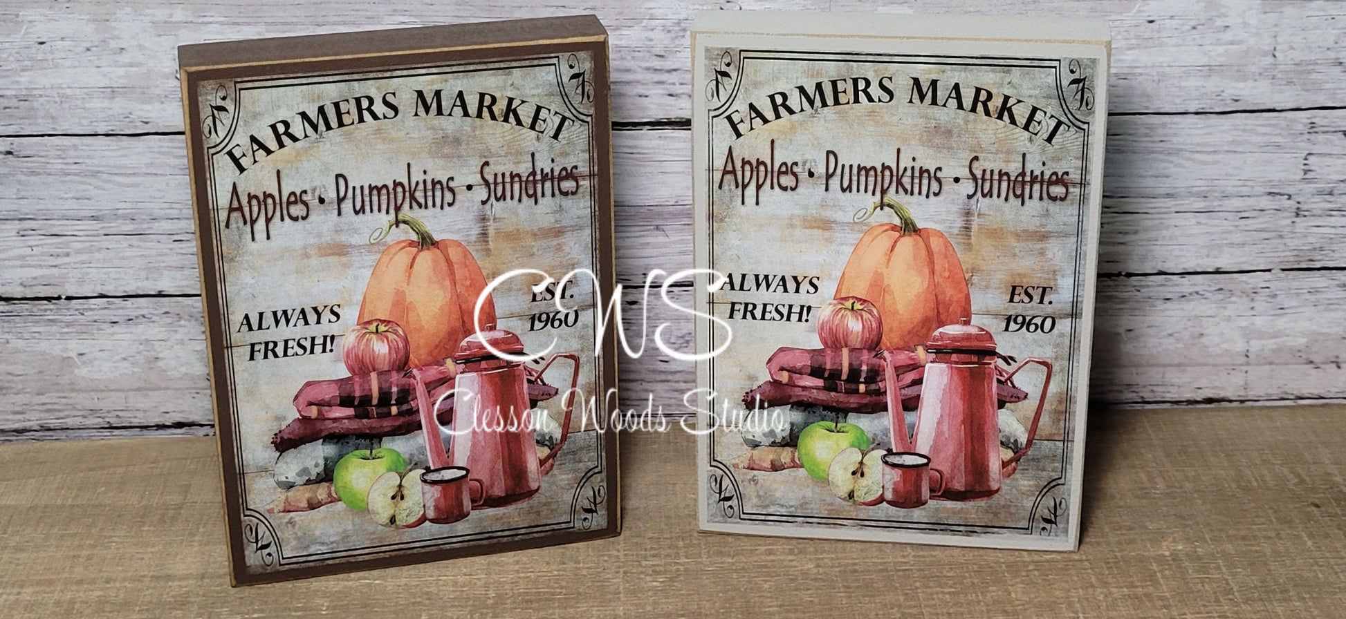 Farmers Market Apples Pumpkins Sundries Wood Sign comes in two sizes. Small is 4” x 5.5” and Large is 5.5” x 7.5” and both are ¾” thick. I use high quality satin finish paint for exceptional results. The printed image is printed on specialty adhesive paper and permanently applied to the painted surface. I shade around the image with matching paint to blend the image into the block for a quality décor piece you will be proud to display or give as a gift. The edges are sanded for a slightly worn look. With two sizes available these are great décor pieces for tiered trays, counter, shelf, table or desk. Not suitable for outdoor use.
