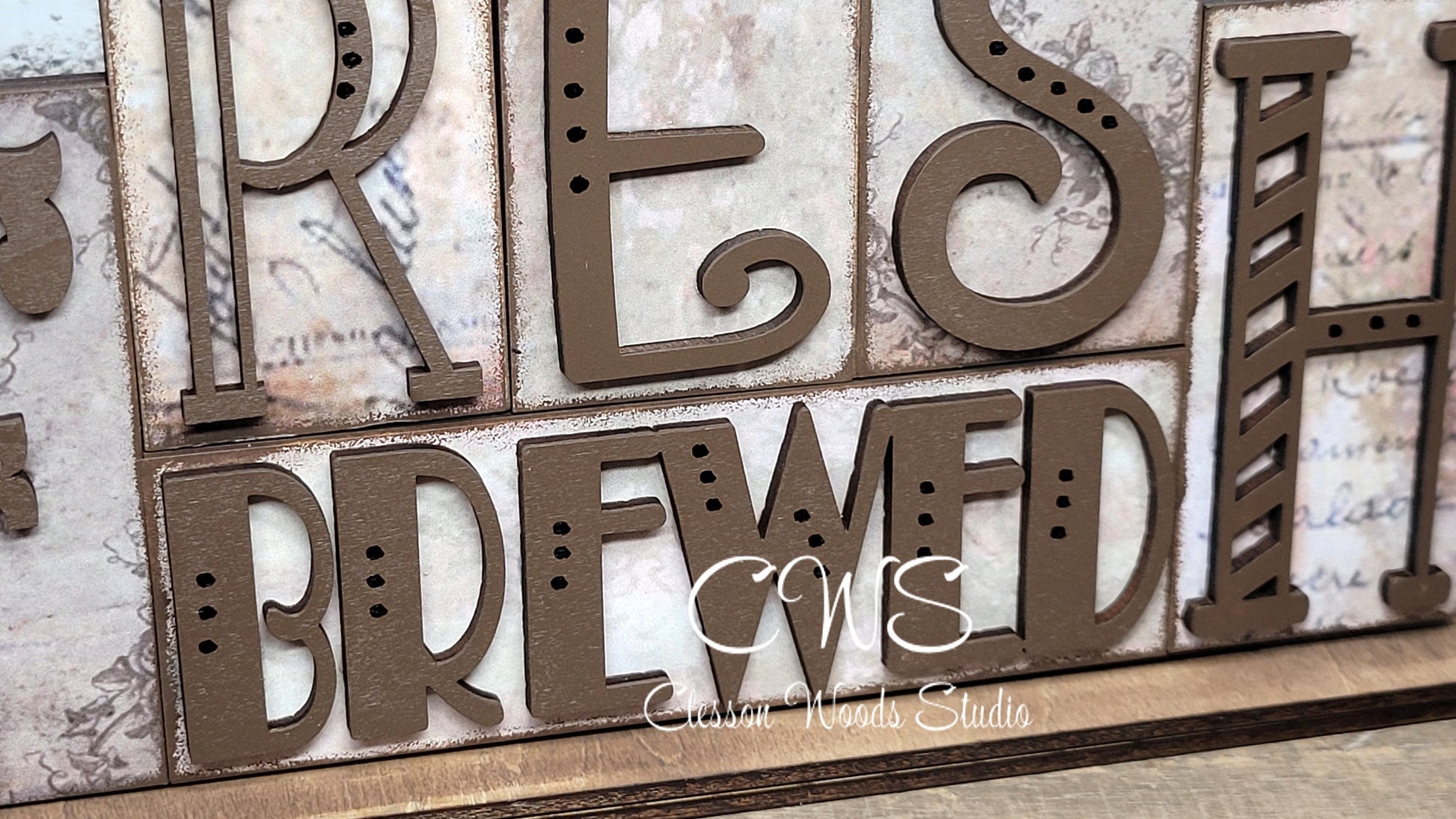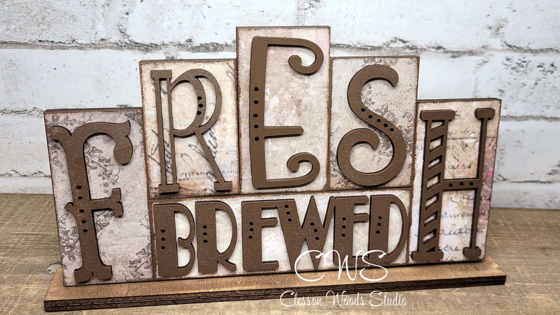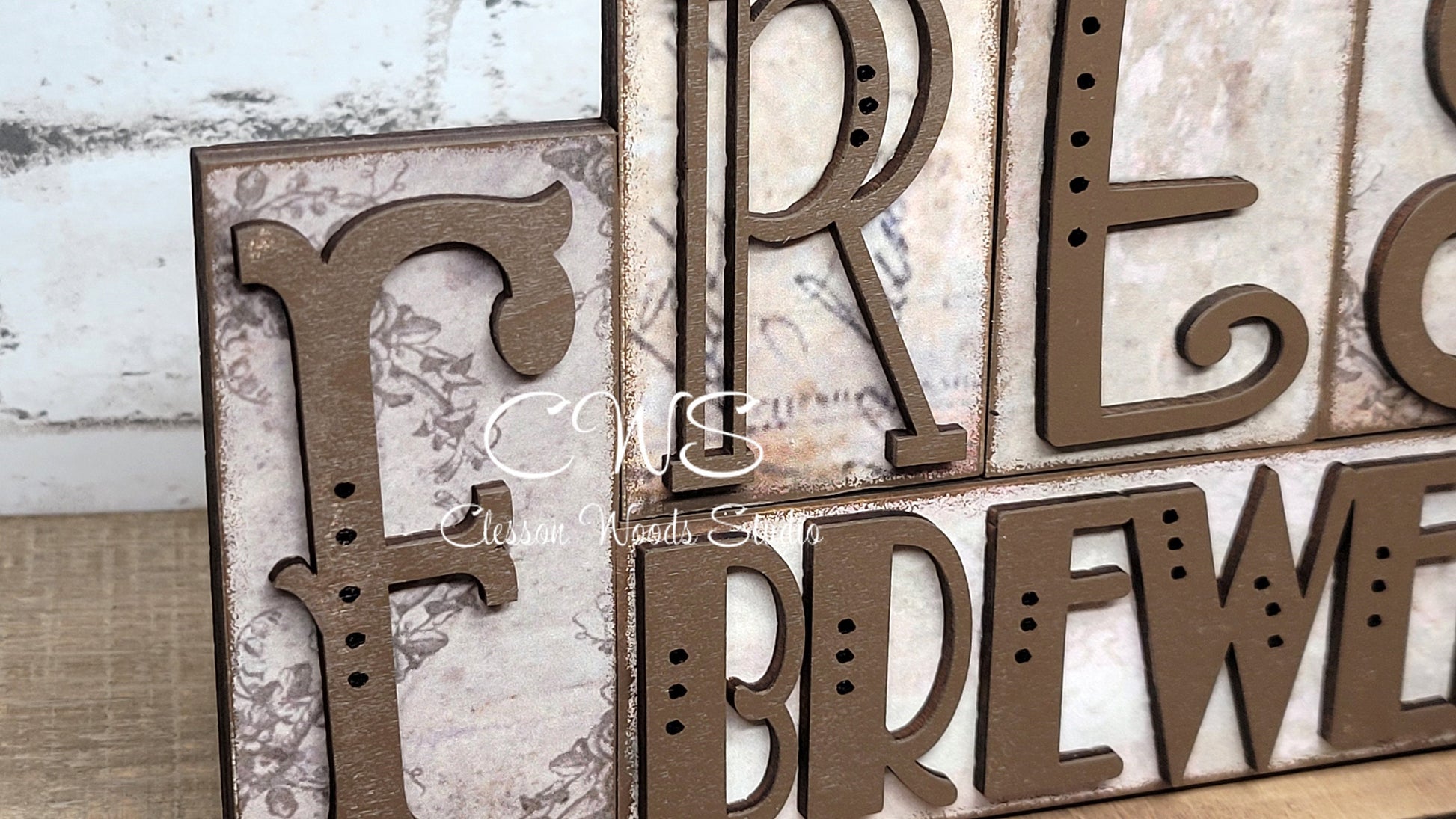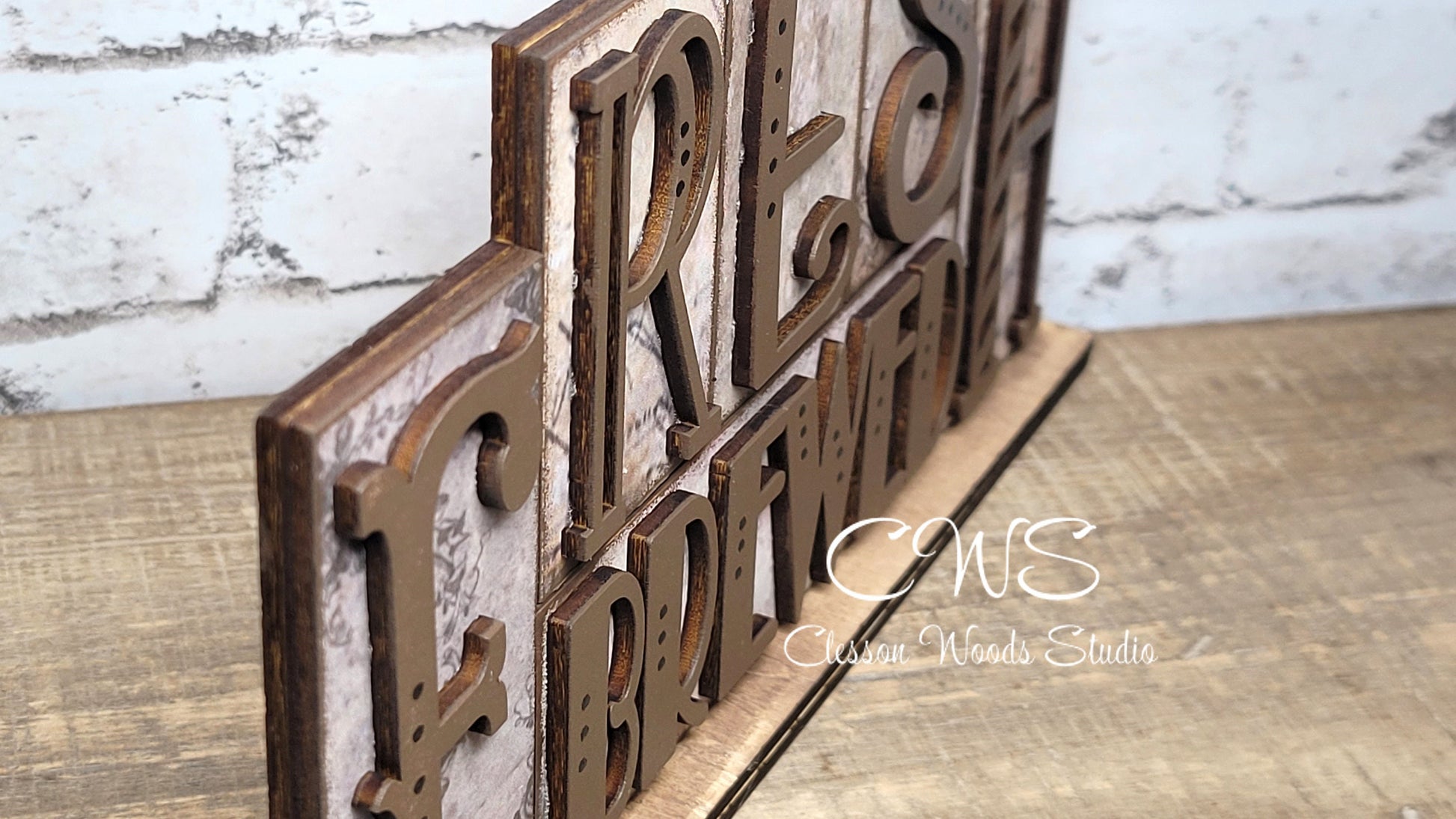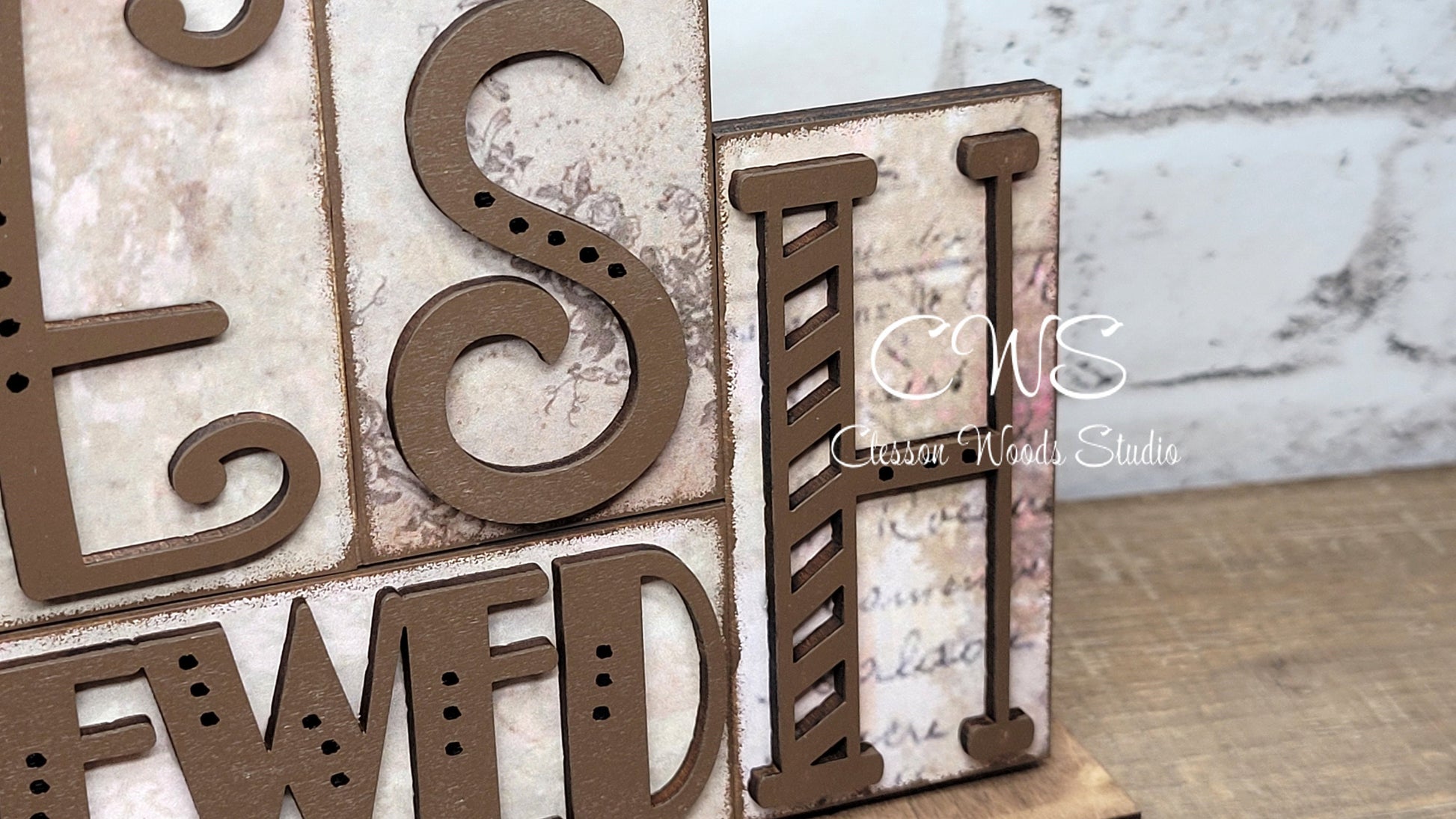 A new line of standing word signs with more designs to come. These word signs have 3 layers plus the base. Each layer is carefully cut with my laser from 1/8" wood. Each letter block has muted brown and tan tones background that I selected and printed on specialty adhesive paper, Each block is also shaded with paint around the edges. The letters are laser cut from 1/8" wood and painted brown. All of these standing word signs contain multiple layers and pieces that are individually painted, assembled and glued for a high quality finished decor piece for your home, office or gift giving. A nice size for countertops, window sills, tables, desks or any place you need a seasonal decor piece. Simply set the word sign into the base.