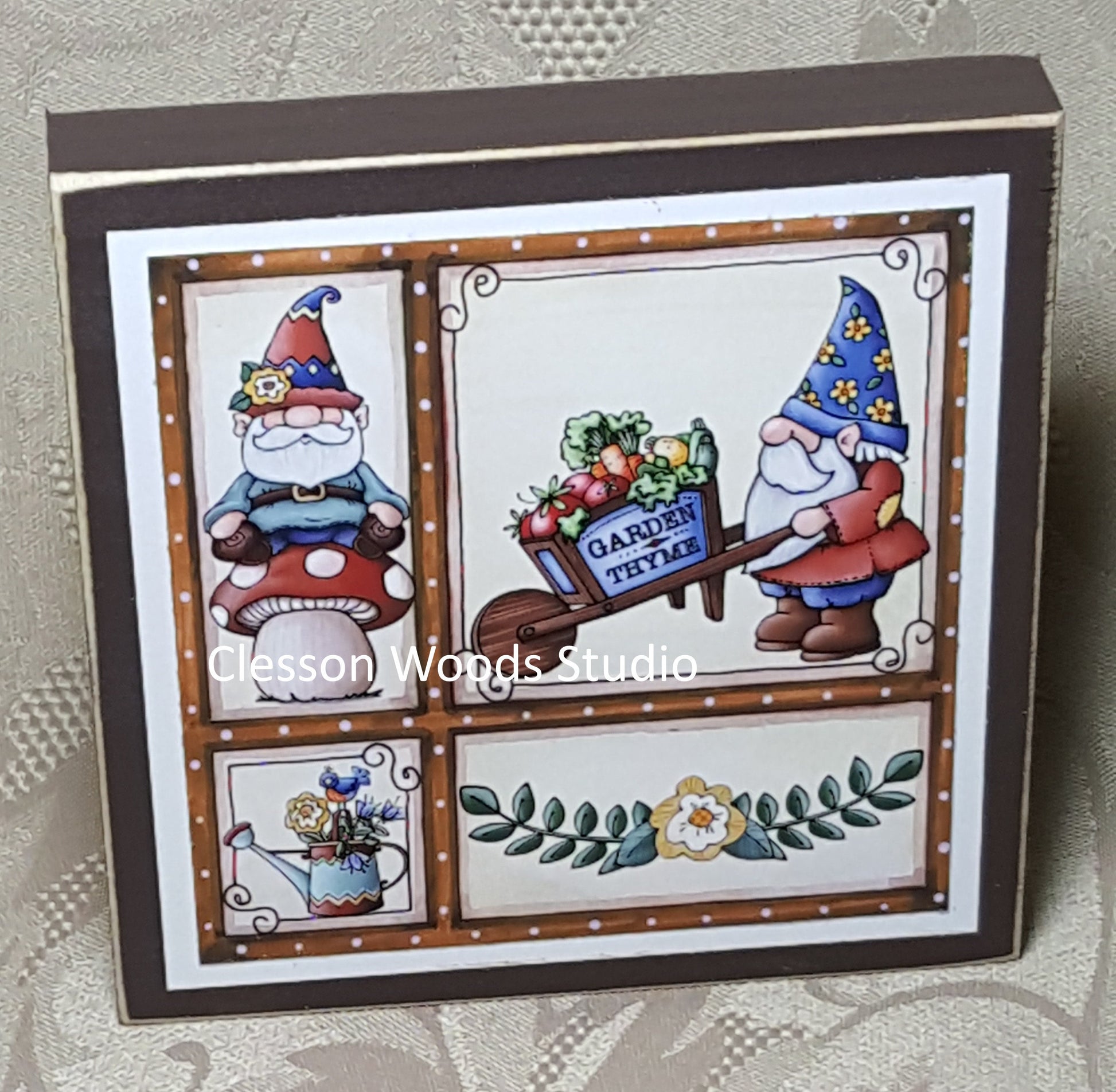 Garden Gnome Friends Small Square Wood Block Sign (Wheelbarrow)