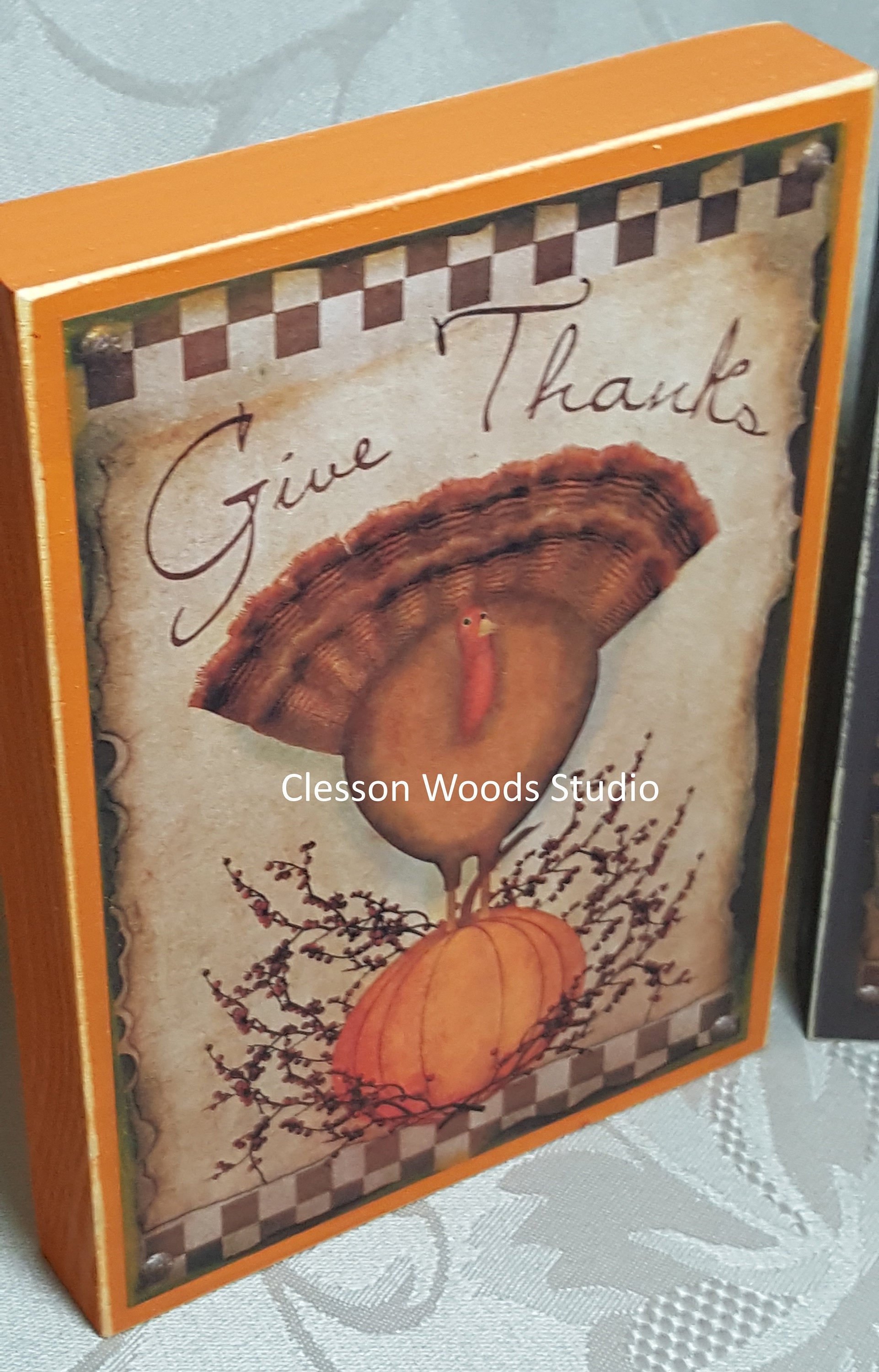 Give Thanks Turkey Small Wood Block Sign comes in two sizes. Small is 4” x 5.5” and Large is 5.5” x 7.5”. I start with ¾” thick premium pine that I cut to size. I use high quality satin finish paint for exceptional results. The printed image is permanently applied to the painted surface. I shade around the image with matching paint to blend the image into the block for a quality décor piece you will be proud to display or give as a gift. The edges are sanded for a slightly worn look. With two sizes available these are great décor pieces for tiered trays, counter, shelf, table or desk.
