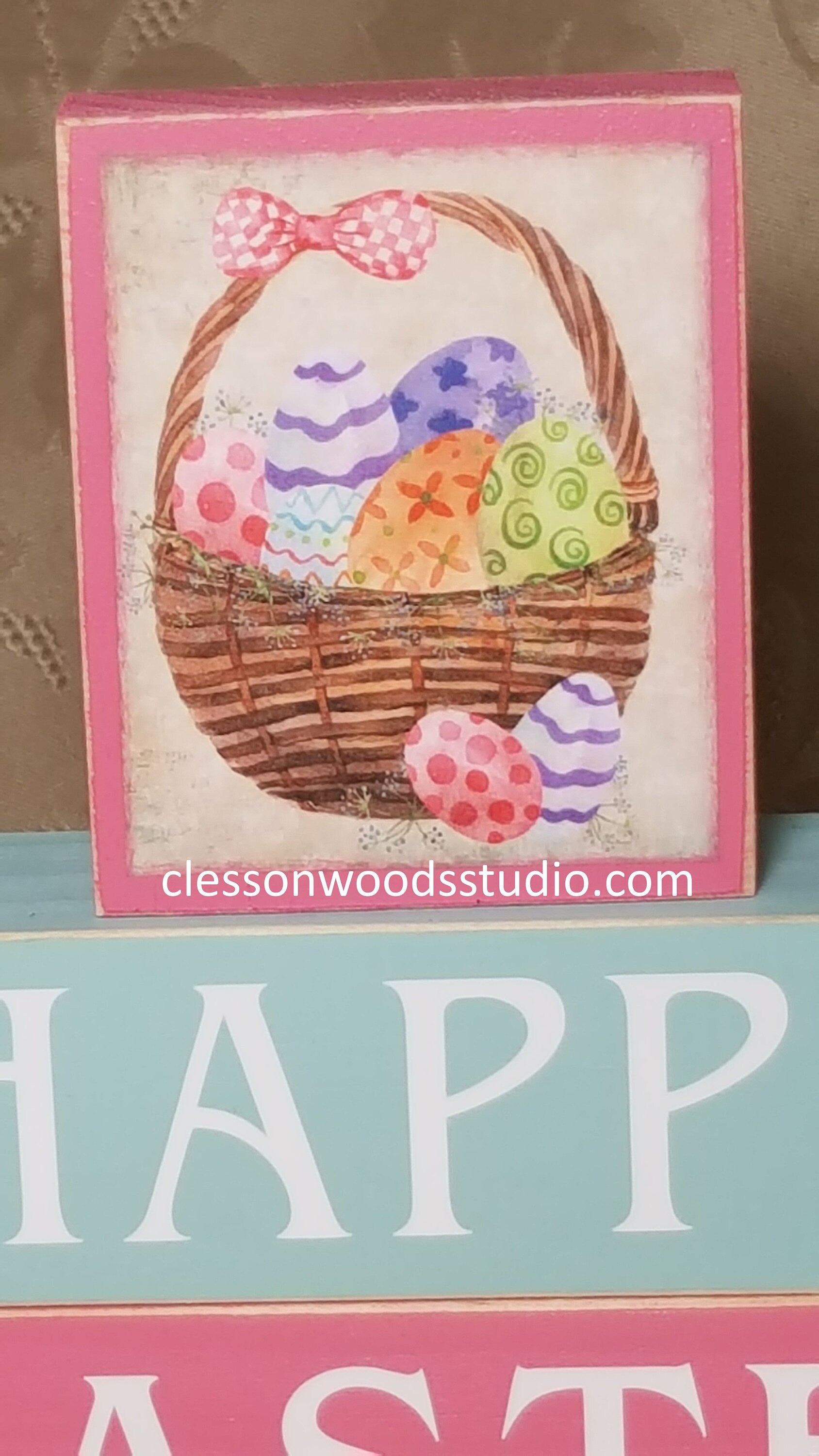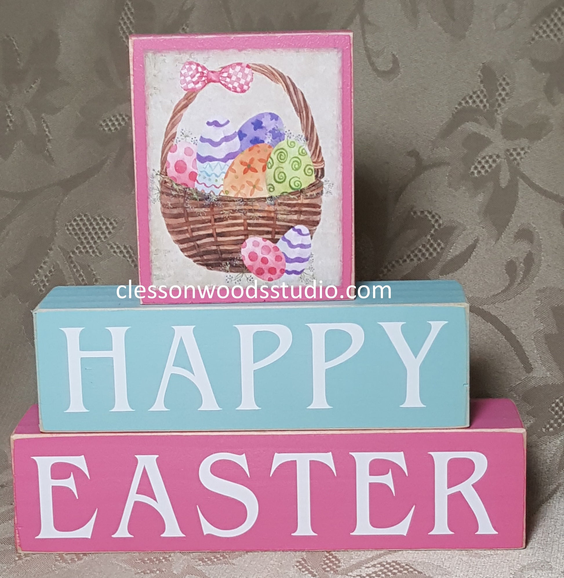 Welcome Easter with this wood block set. Each set is made from high quality wood and painted with high quality satin finish paint on all sides. Each block's edges are sanded for a slightly worn look. The stack is 6" wide and 5 1/2" tall. The word blocks are 1 1/2" thick (6" long and 5" long) and the top block is 3/4" thick (2 1/2" x 3"). I cut permanent white vinyl for the lettering for a crisp look. I printed the image on the top block and permanently applied it to the wood. These blocks are not glued together for ease of shipping and your off-season storage.