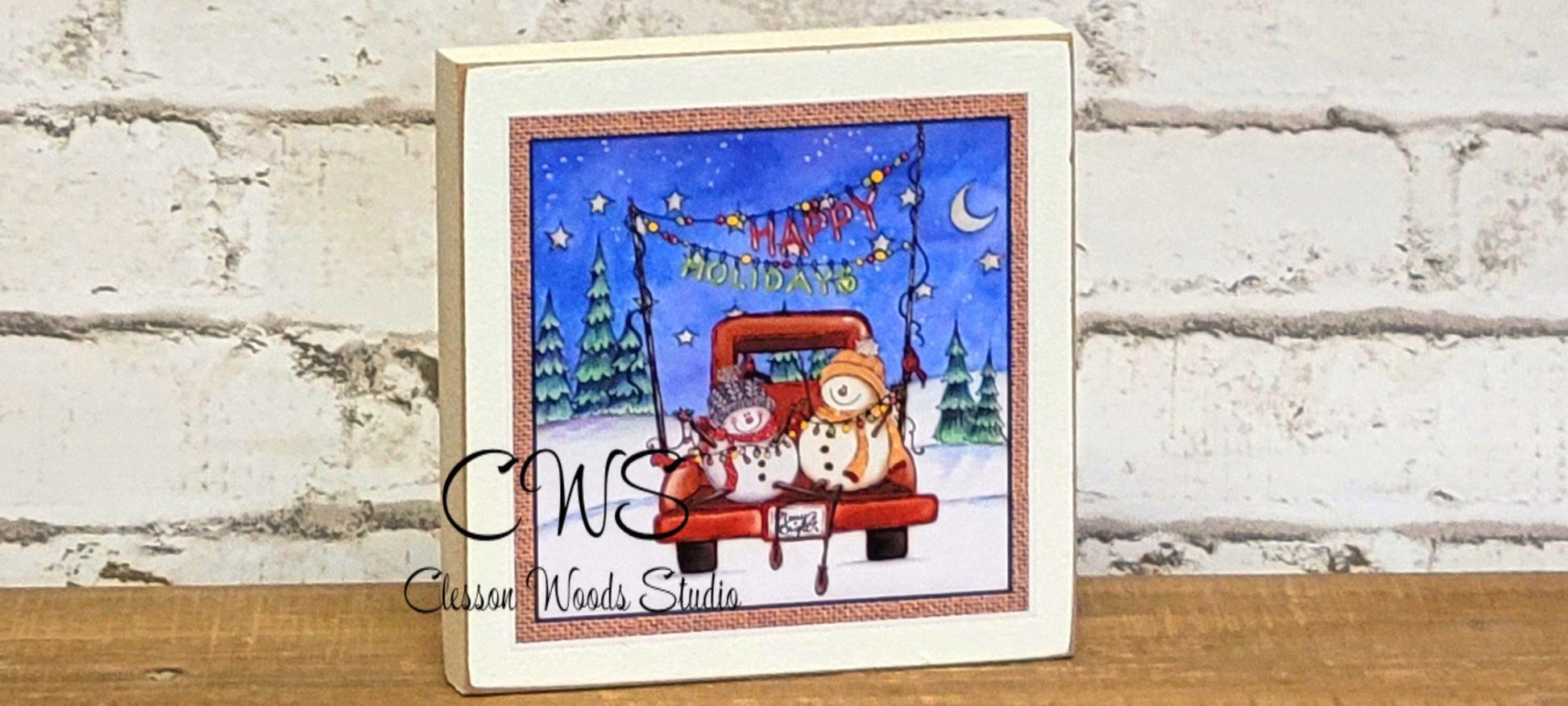 Happy Holidays Two Cute Snowmen in Red Truck Square Wood Sign