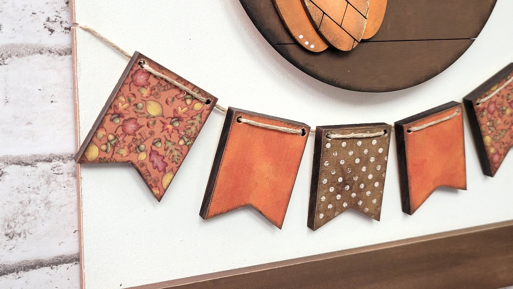 The banner is laser cut and finished with either coordinating papers, paint and laser cut accents or a combination of any of these. Jute joins the pieces and ties around the back of the sign. Small slots in each side assures perfect banner placement.
