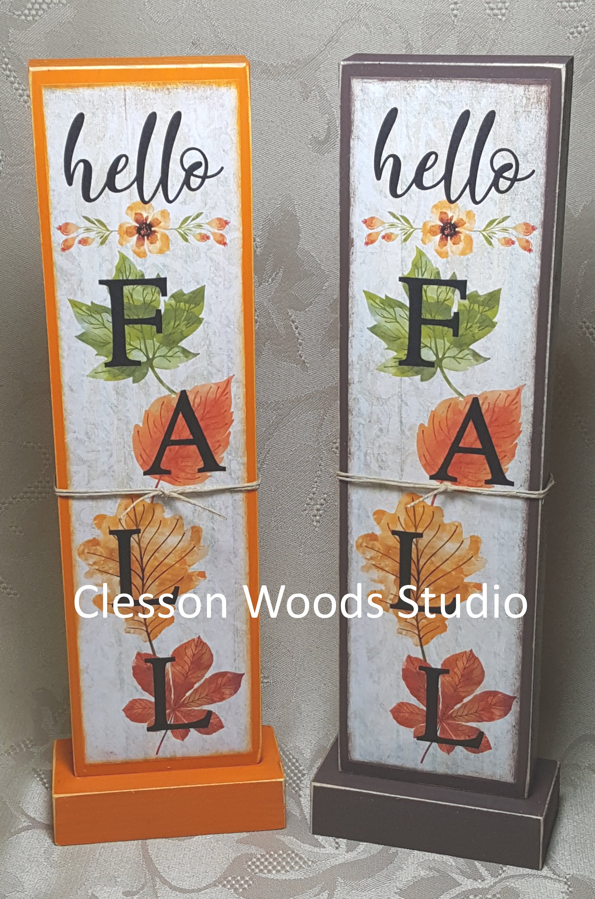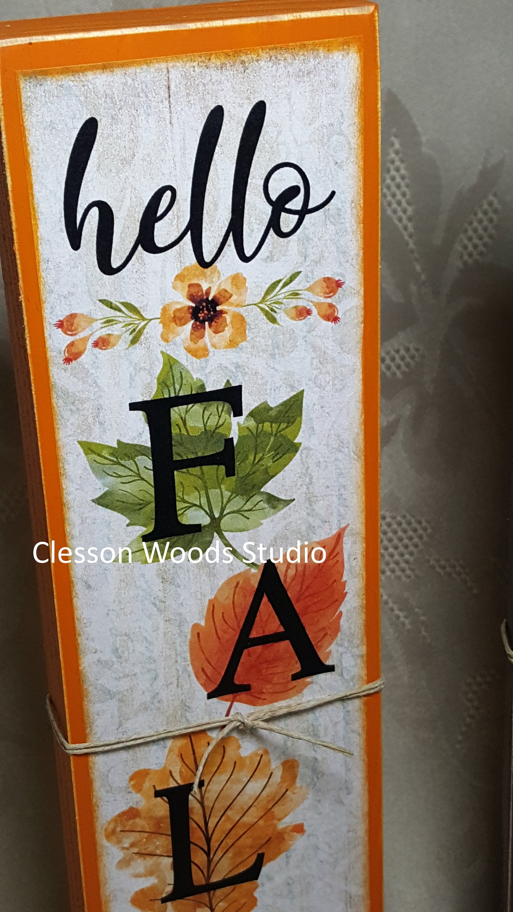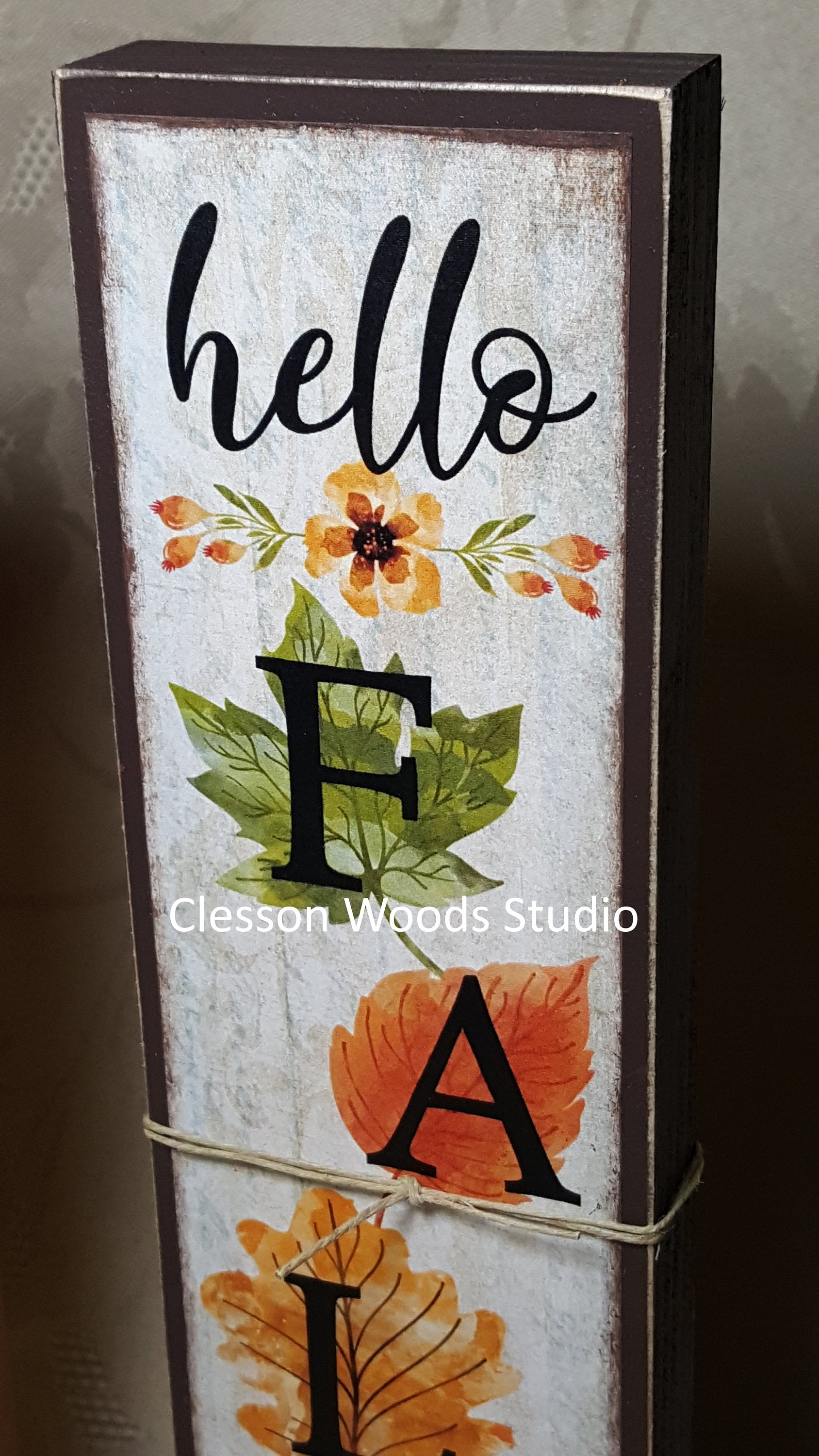 Bring the look of a signboard from your porch into your home. You will love the smaller version of this popular decor. It is perfect for your counter, table, desk or shelf. I hand select premium pine (no knots) and cut to 2.50" x 9" and 3/4" thick. I use only the highest quality satin finish paint (brown or orange) to paint the entire wood piece. I created and printed the design and permanently applied it to the wood. I also use matching paint to blend the design into the painted wood block. I added the base with a screw. All edges are sanded for a slightly worn look. SHOP DIRECT FROM THE STUDIO AND SAVE! clessonwoodsstudio.com