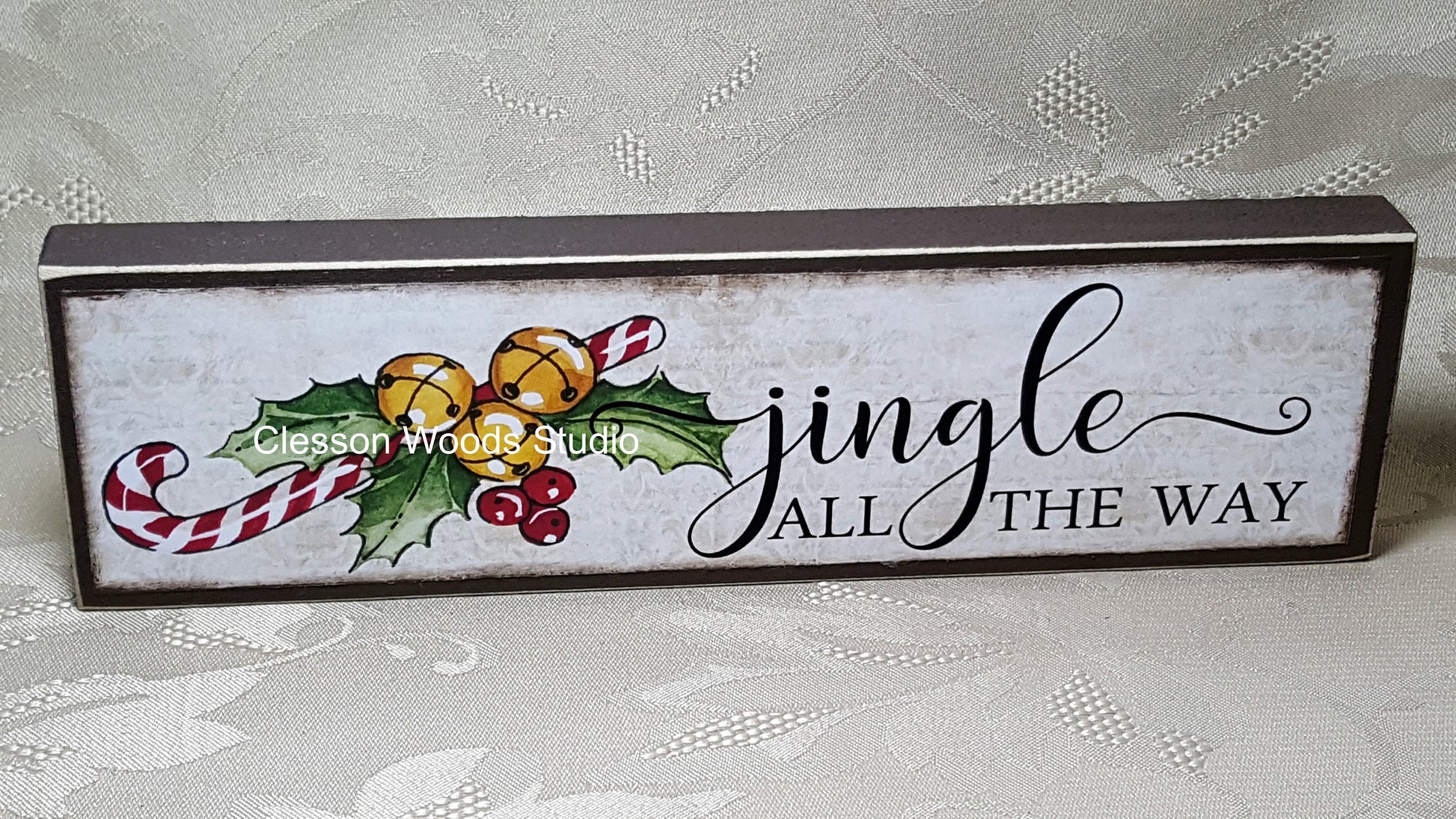 This Holly and Candy Cane Jingle All The Way wood sign is great for your shelf, desk or table. I have made this seasonal shelf sitter from high quality 3/4" pine that is cut to 2 1/2" x 9". The entire piece is painted a rich autumn brown with the front edges sanded to reveal the raw wood under. I designed the saying and permanently applied it to the wood. A final step of distressing the edges of the saying to blend it into the block makes this a high quality decor piece for your home. SHOP DIRECT FROM THE STUDIO AND SAVE! clessonwoodsstudio.com