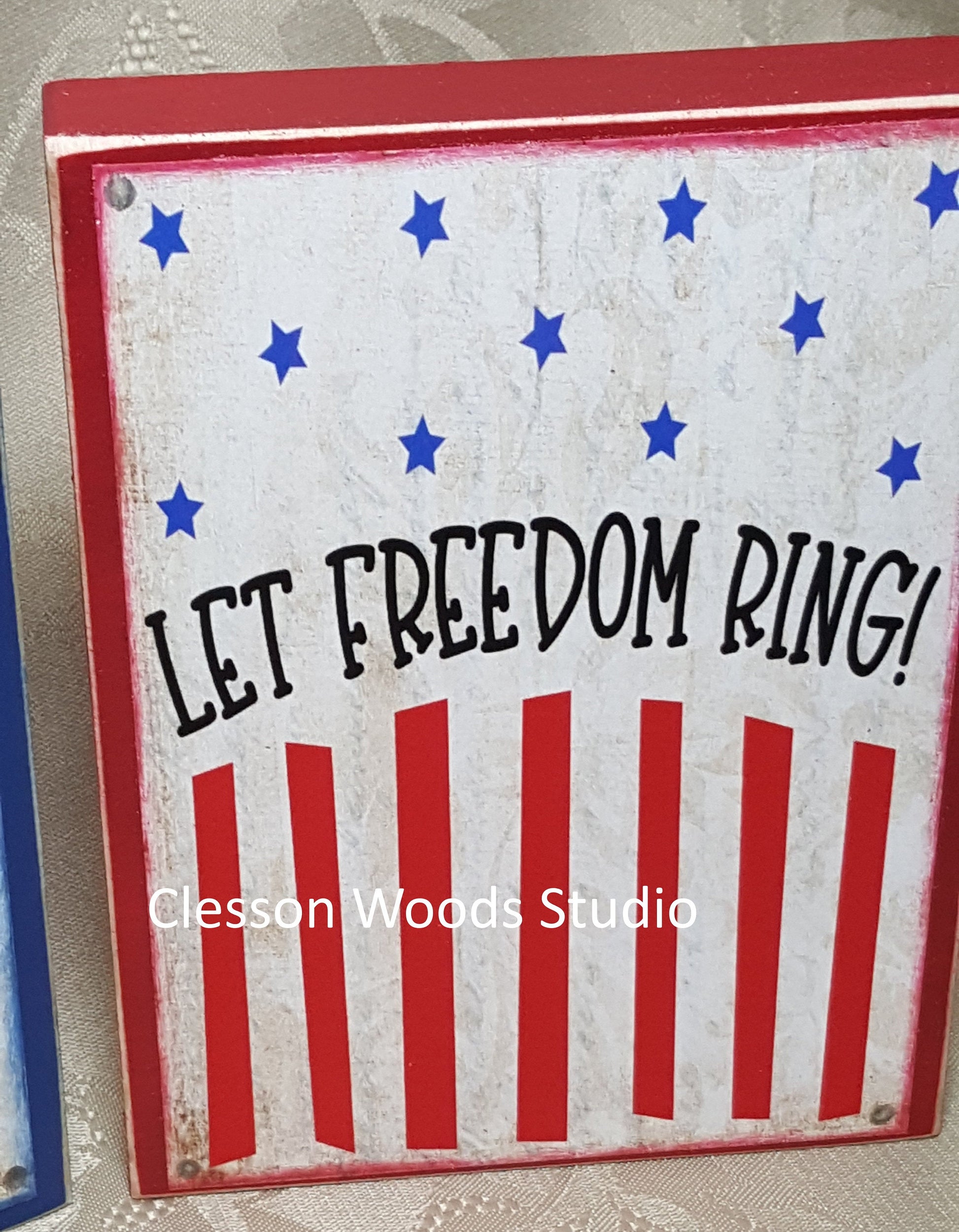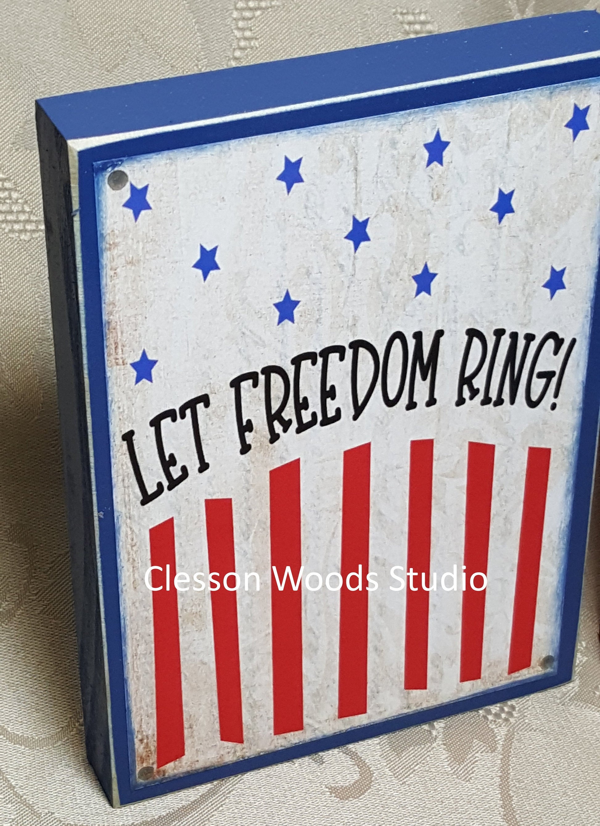Let Freedom Ring Patriotic small wood block sign comes in two sizes. Small is 4” x 5.5” and Large is 5.5” x 7.5”. I start with ¾” thick premium pine that I cut to size. I use high quality satin finish paint for exceptional results. The printed image is permanently applied to the painted surface. I shade around the image with matching paint to blend the image into the block for a quality décor piece you will be proud to display or give as a gift. The edges are sanded for a slightly worn look. With two sizes available these are great décor pieces for tiered trays, counter, shelf, table or desk.