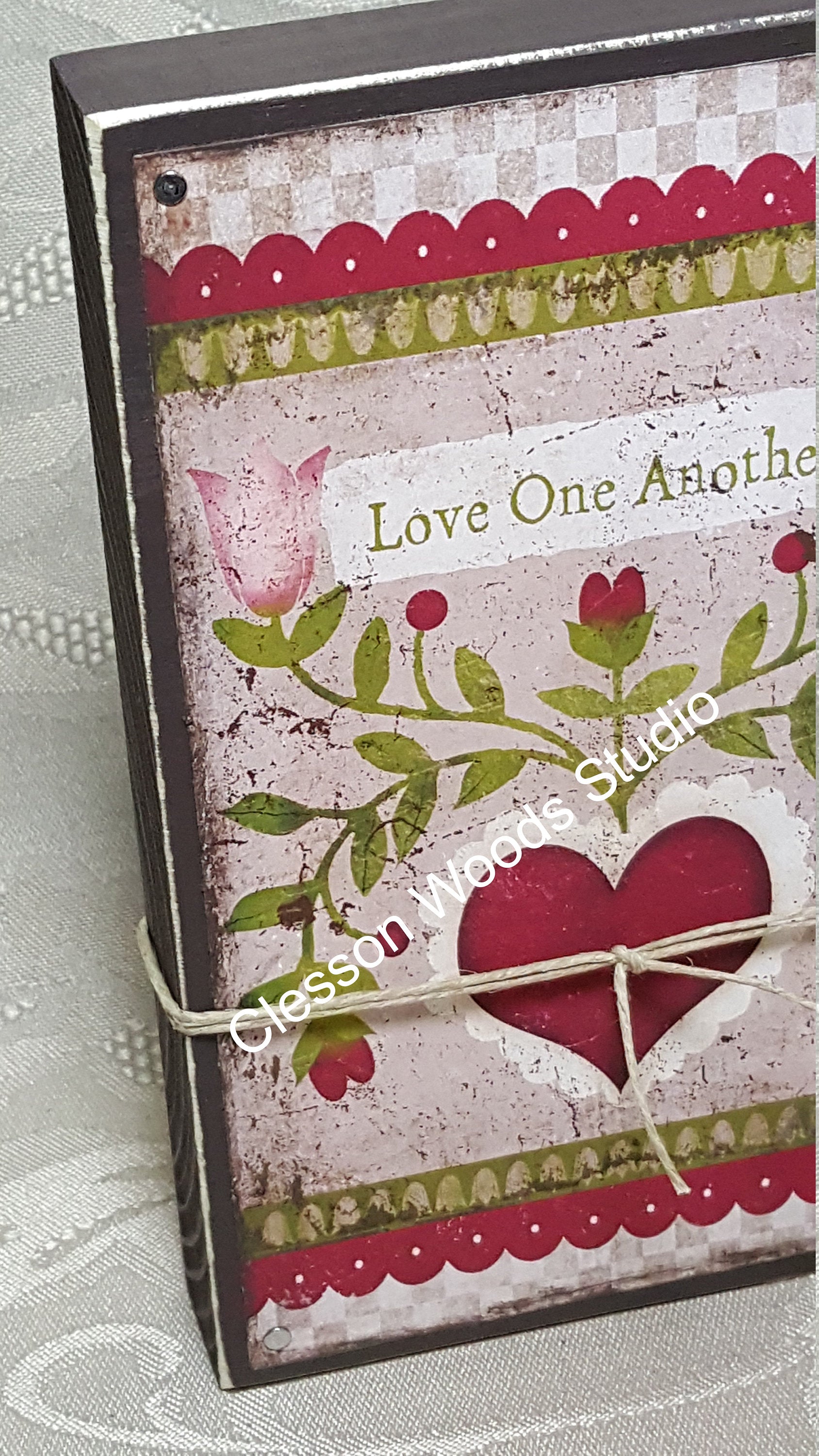 Welcome Valentine's Day, Spring or everyday with this wood accent block. Love One Another comes is two sizes. You choose 4" x 5 1/2" (small) or 5 1/2" x 7 1/2" (large) and they are 3/4" thick. Each wood block sign is a rich autumn brown in a satin finish with the printed Love One Another design permanently applied. All edges have been hand distressed with paint, edges sanded and wrapped with thin jute.