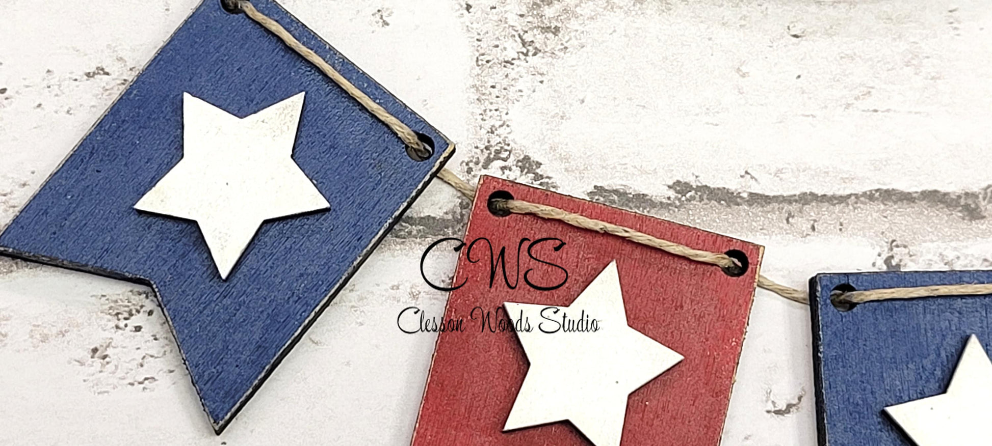 The banner is laser cut and finished with either coordinating papers, paint and laser cut accents or a combination of any of these. Jute joins the pieces and ties around the back of the sign. Small slots in each side assures perfect banner placement.