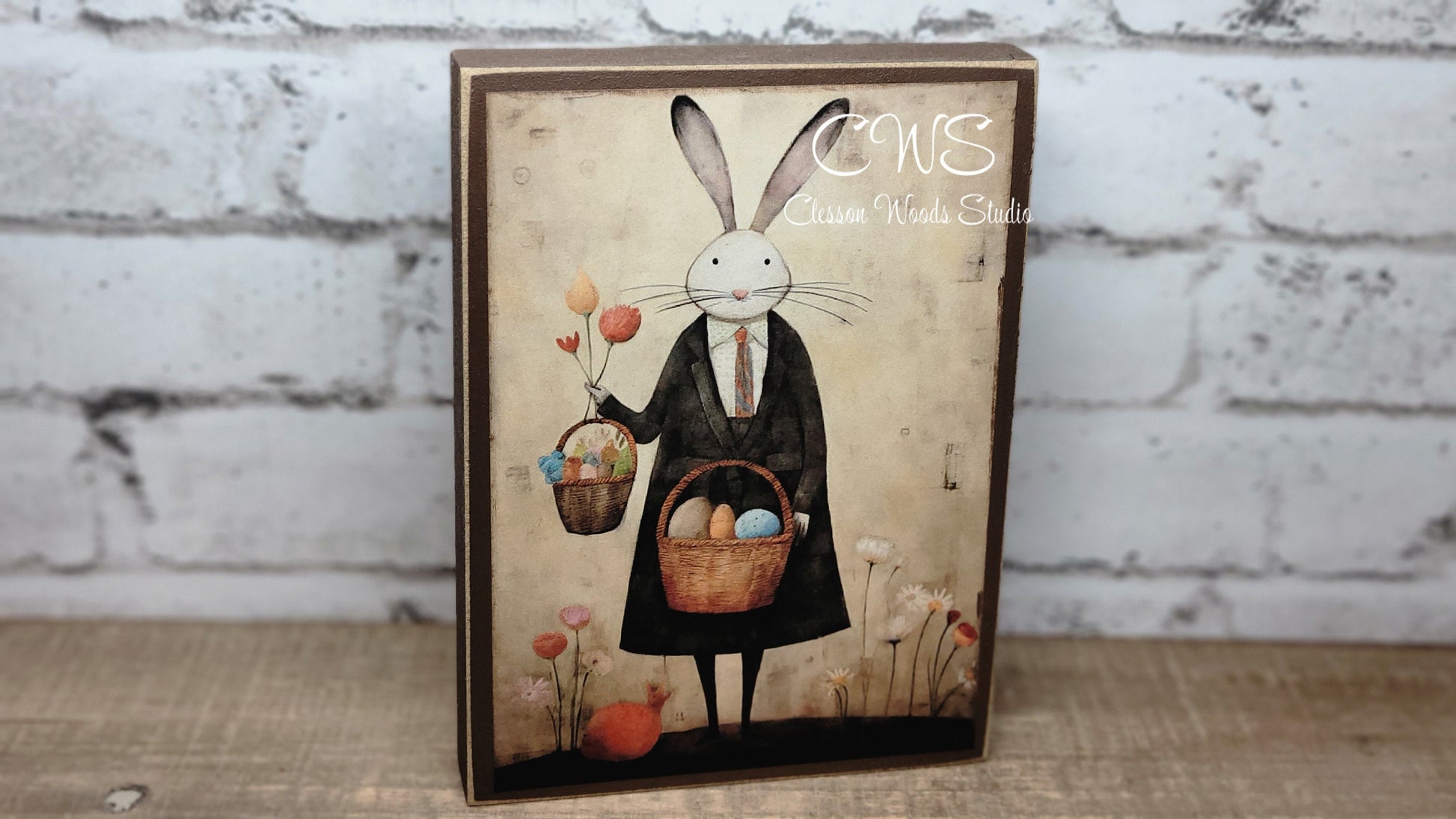Primitive Easter Bunny 3 Brown Wood Block Sign