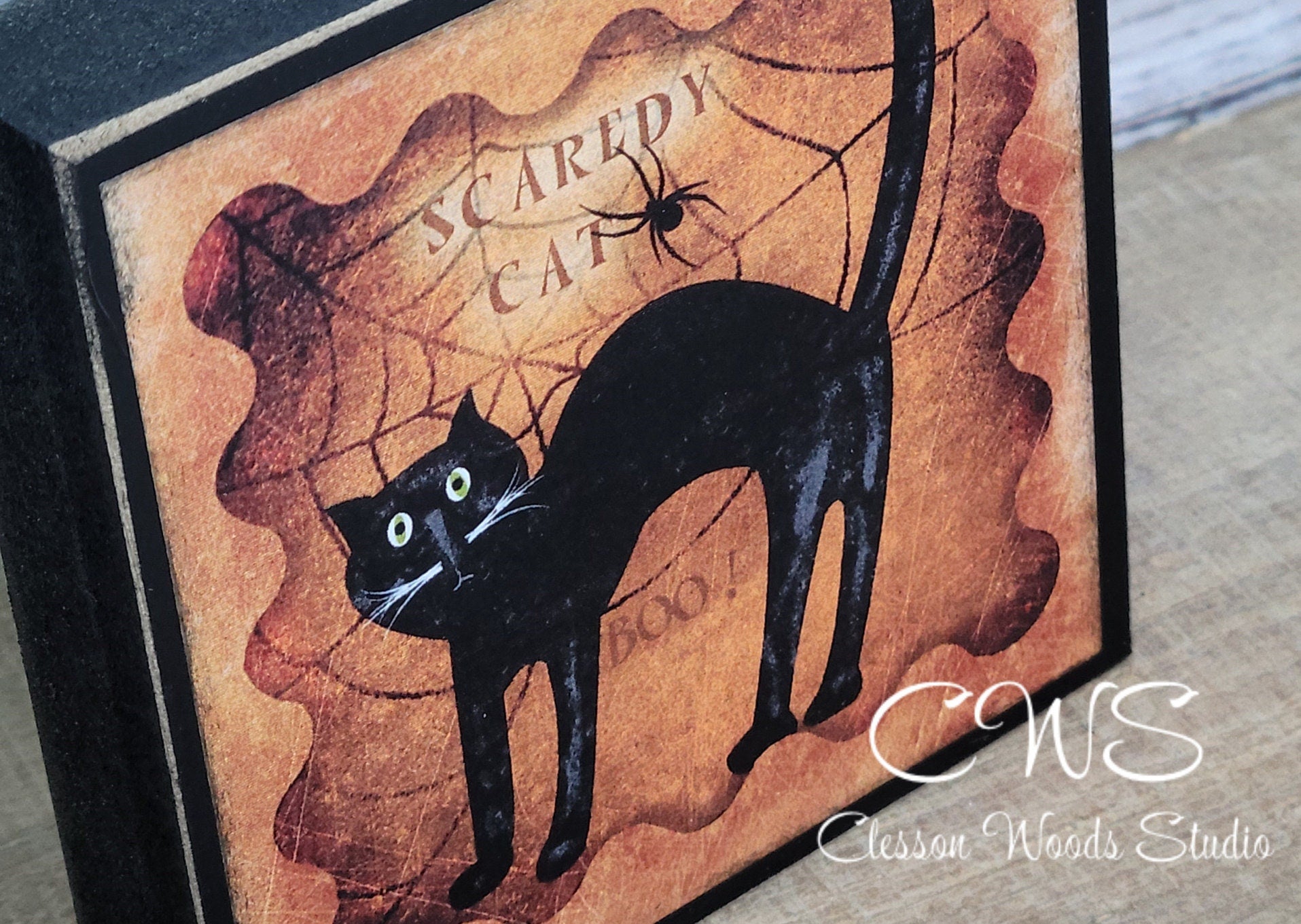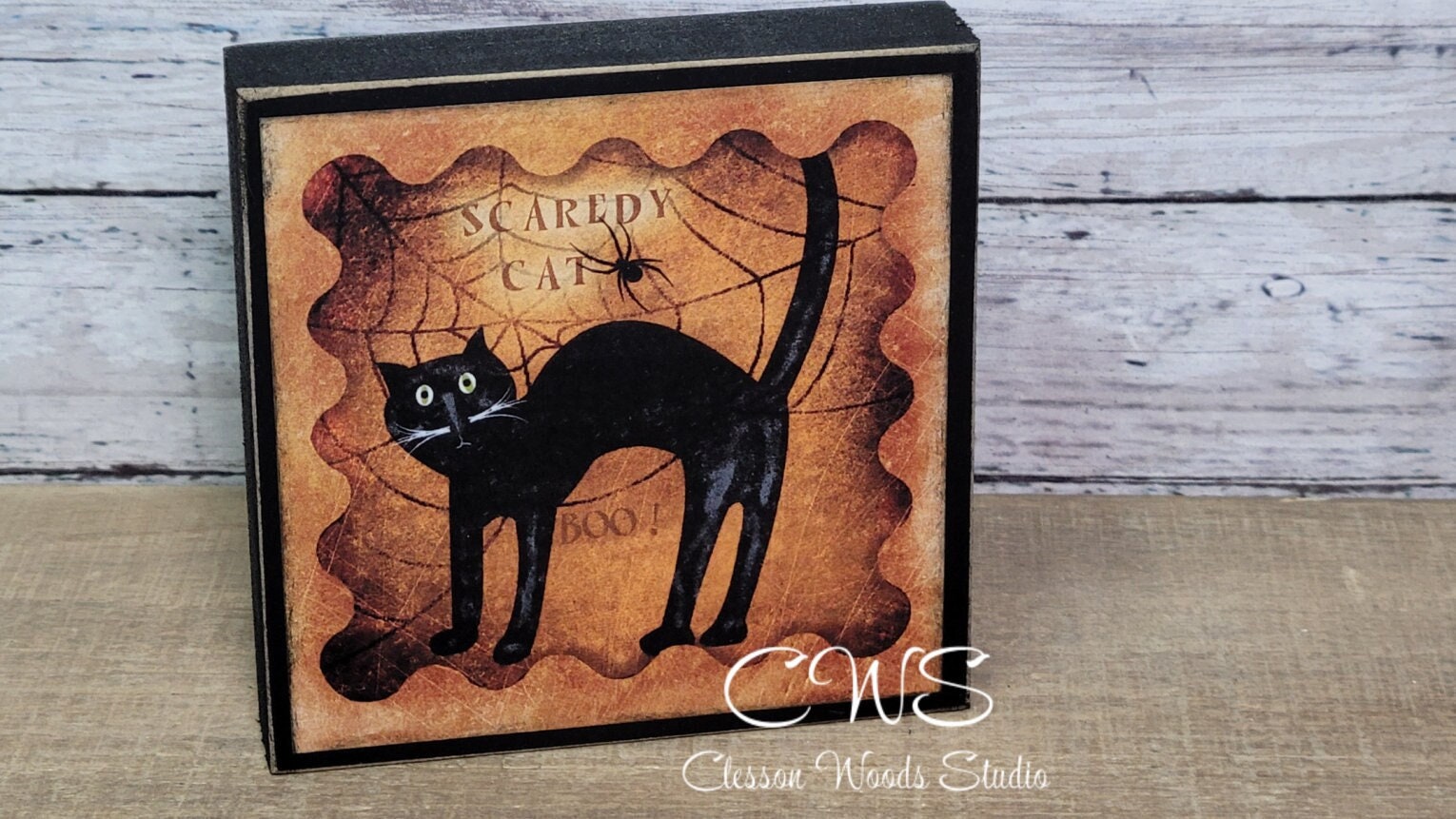 Primitive Halloween Scaredy Cat Wood Block Sign comes in two sizes. Small is 4.5” x 4.5” and Large is 5.5” x 5.5” and are ¾” thick. I use high quality satin finish paint for exceptional results. The printed image is printed on specialty adhesive paper and permanently applied to the painted surface. I shade around the image with matching paint to blend the image into the block for a quality décor piece you will be proud to display or give as a gift. The edges are sanded for a slightly worn look. With two sizes available these are great décor pieces for tiered trays, counter, shelf, table or desk. Not suitable for outdoor use. Not suitable for outdoor use.