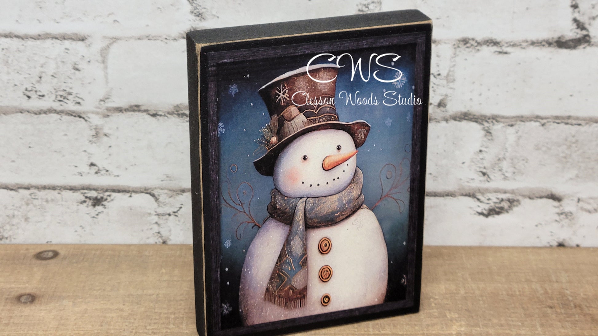 Primitive Snowman Black Frame Winter Wood Block Sign