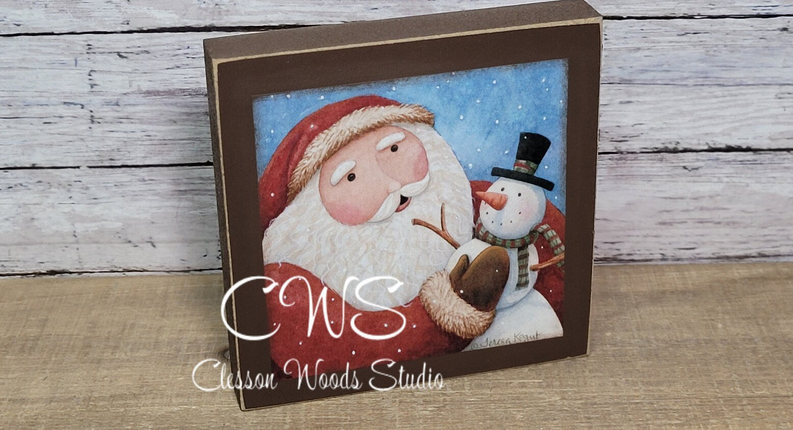 Santa Holding Snowman Square Wood Sign comes in two sizes. Small is 4.5” x 4.5” and Large is 5.5” x 5.5” and both are 3/4" thick. I use high quality satin finish paint for exceptional results. The printed image is permanently applied to the painted surface. I shade around the image with matching paint to blend the image into the block for a quality décor piece you will be proud to display or give as a gift. The edges are sanded for a slightly worn look. With two sizes available these are great décor pieces for tiered trays, counter, shelf, table or desk.