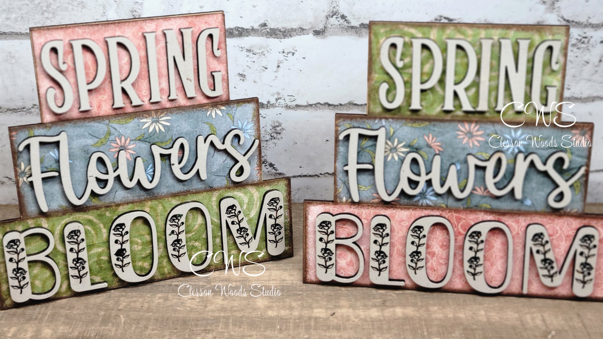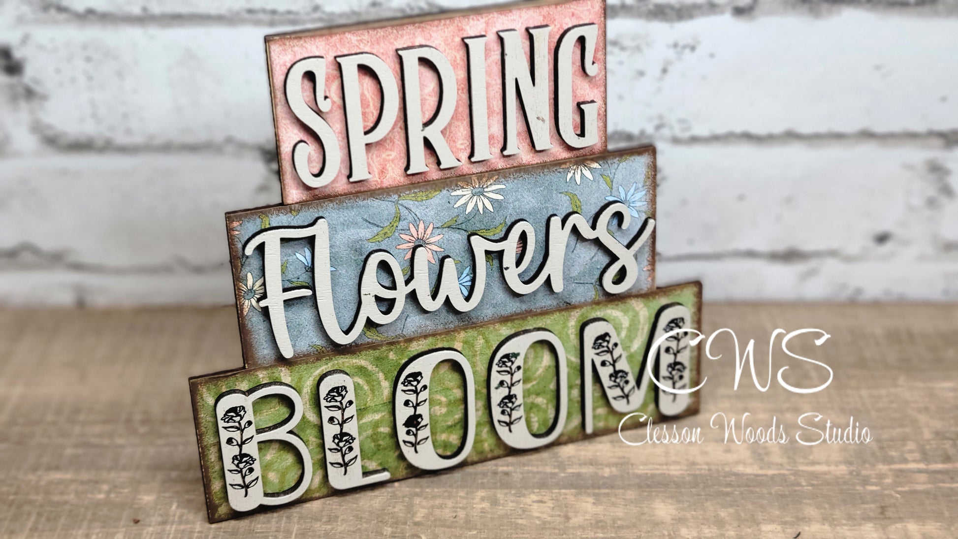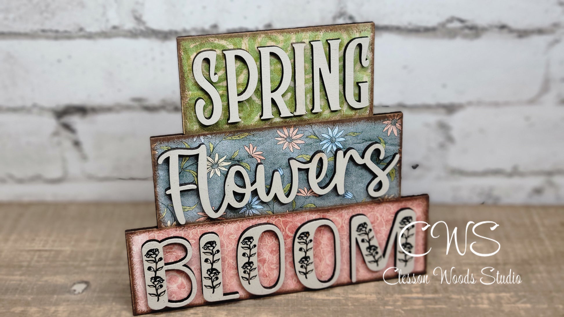 Let the muted spring colors bring some Spring into your decor. These word stackers are cut from 1/8" wood. The sign is 4.5" tall and 4" wide. Each "block" is carefully created with printed paper behind laser cut words. Each word is painted and glued onto the blocks. This sign is small enough for your tiered tray, window sill, desk, table or shelf. For indoor use only.