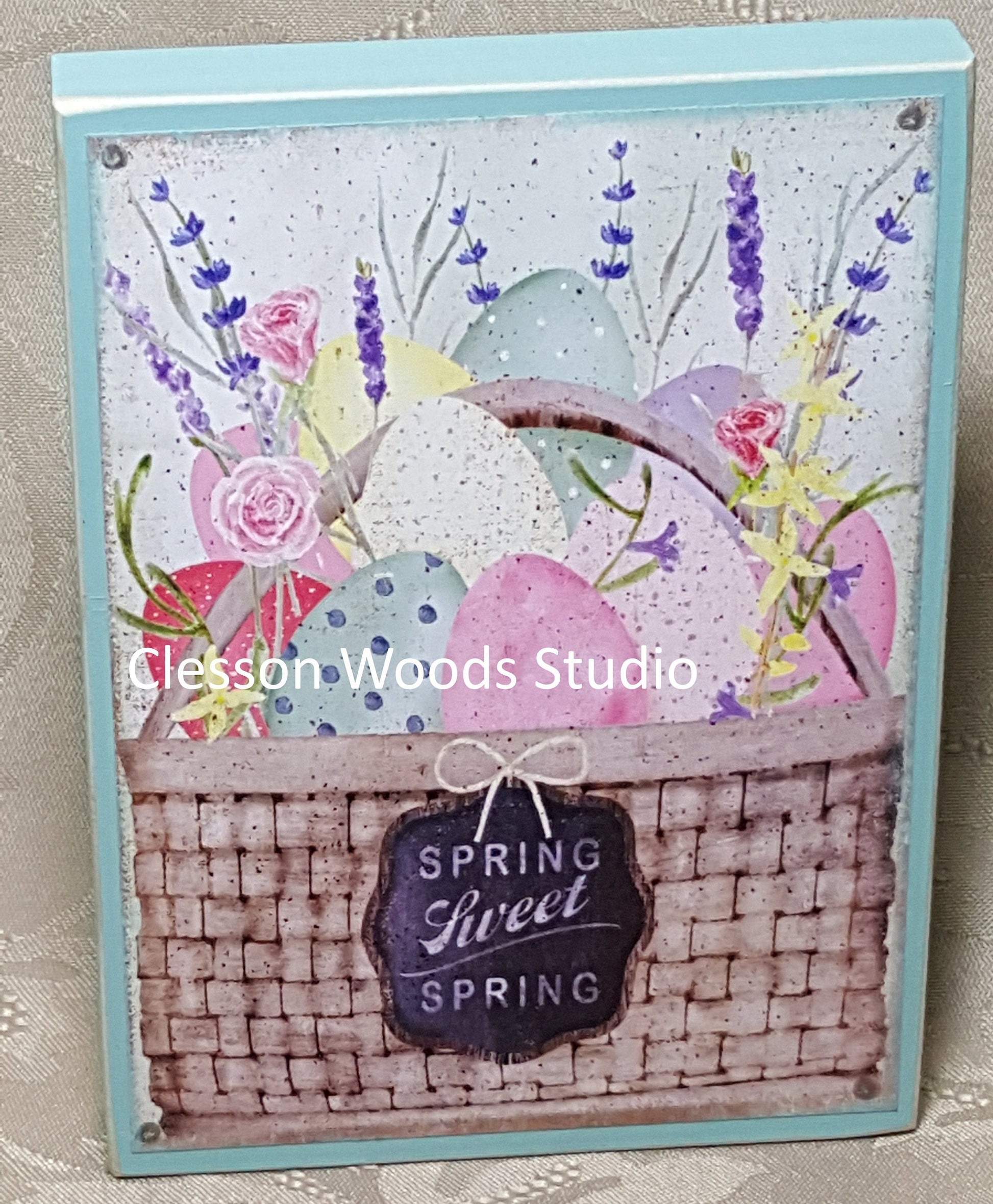 Celebrate Spring with this basket full of pastel colored eggs. This wood sign is made from premium pine (no knots) that I selected and cut to 4" x 5 1/2" (small) and 5 1/2" x 7 1/2" (large) and is 3/4" thick. This wood block sign is painted a light blue in a satin finish. The printed design is permanently applied and all edges of the design have been hand distressed with matching paint to blend into the block. This is the perfect size for your counter, shelf, table or tiered tray display.