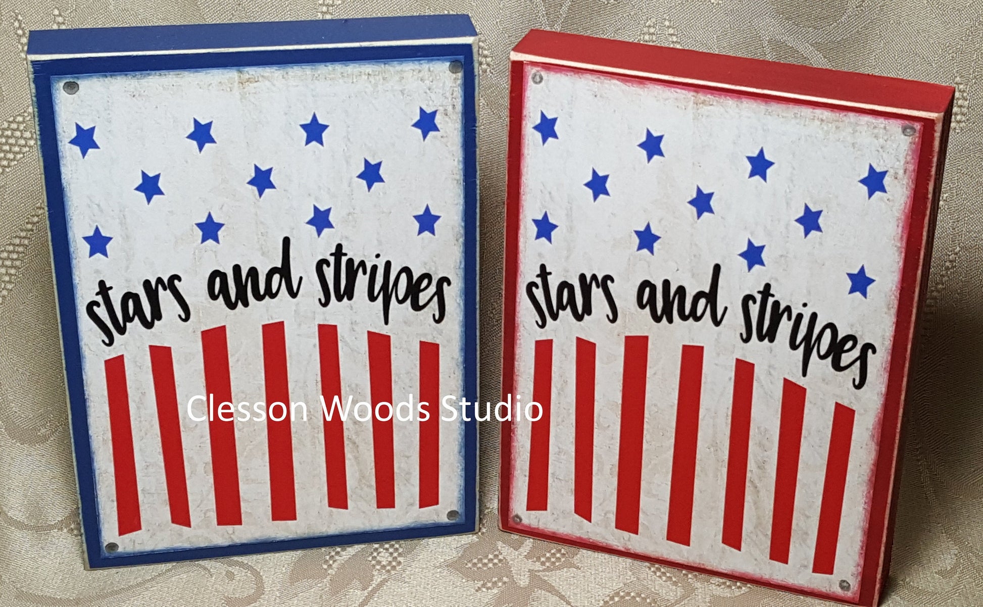 Stars and Stripes Flag Patriotic small wood block sign comes in two sizes. Small is 4” x 5.5” and Large is 5.5” x 7.5”. I start with ¾” thick premium pine that I cut to size. I use high quality satin finish paint for exceptional results. The printed image is permanently applied to the painted surface. I shade around the image with matching paint to blend the image into the block for a quality décor piece you will be proud to display or give as a gift. The edges are sanded for a slightly worn look. With two sizes available these are great décor pieces for tiered trays, counter, shelf, table or desk.