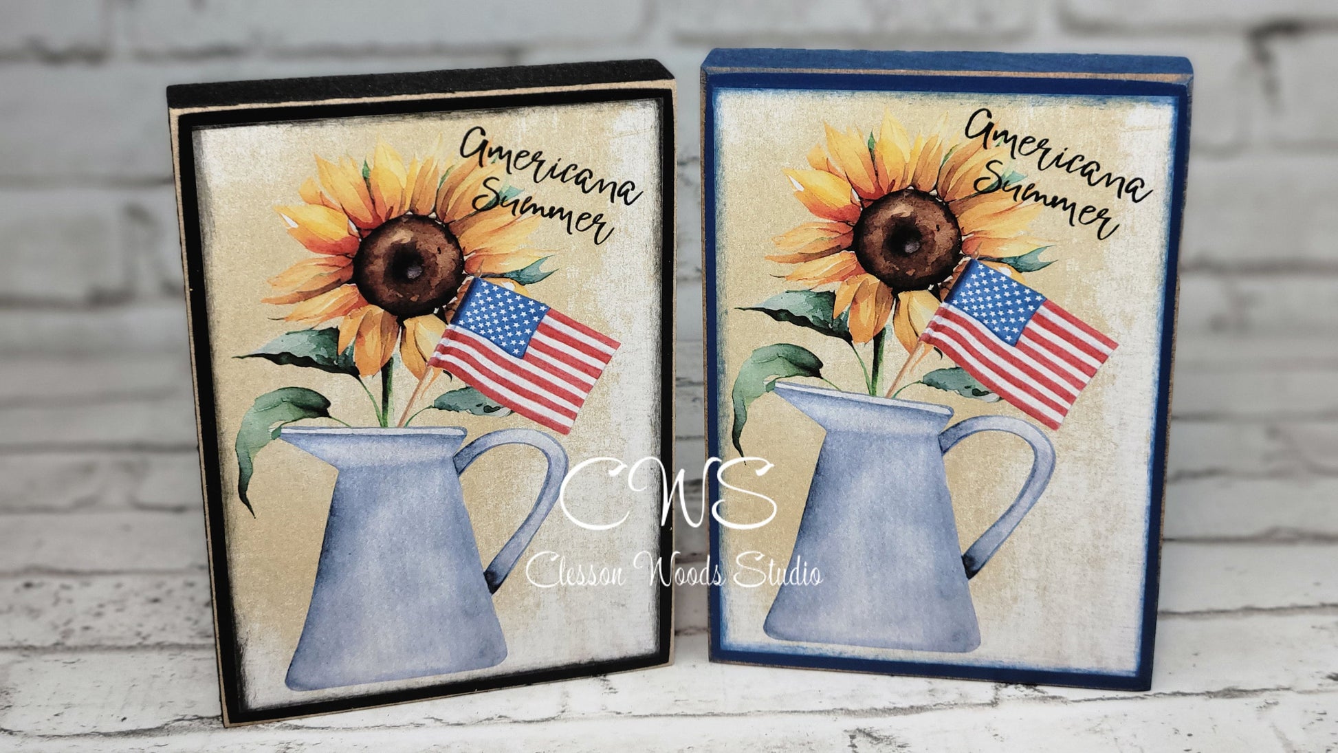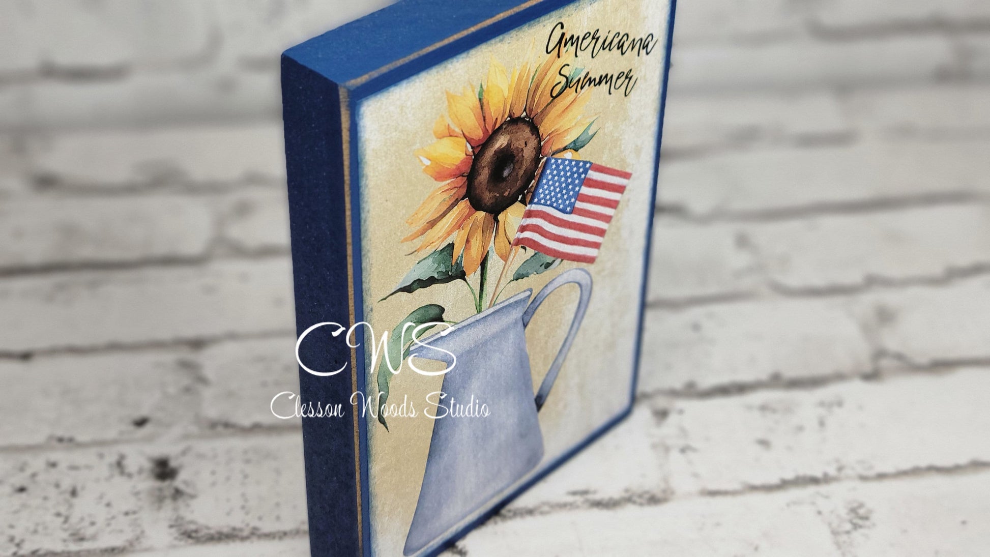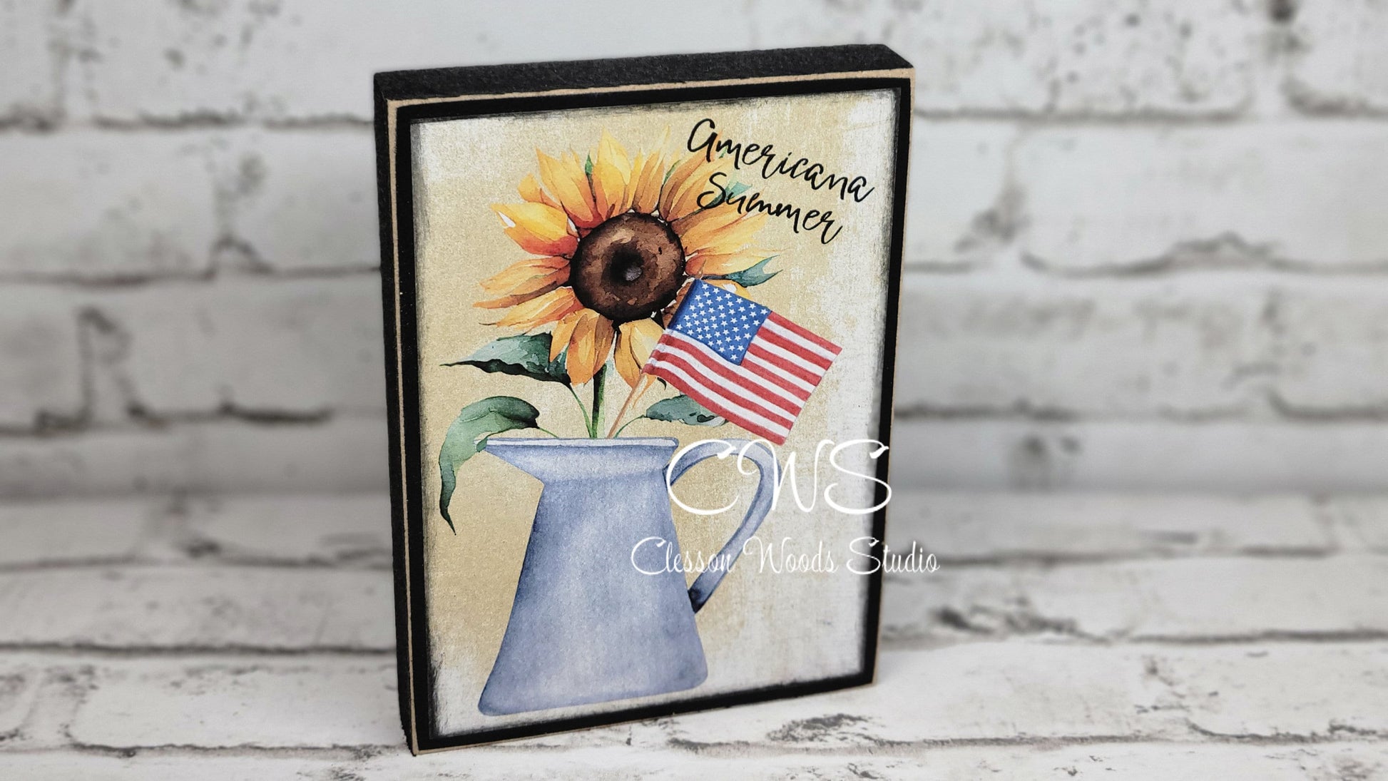 Sunflower Americana Summer Watering Can with Flag Wood Block Sign