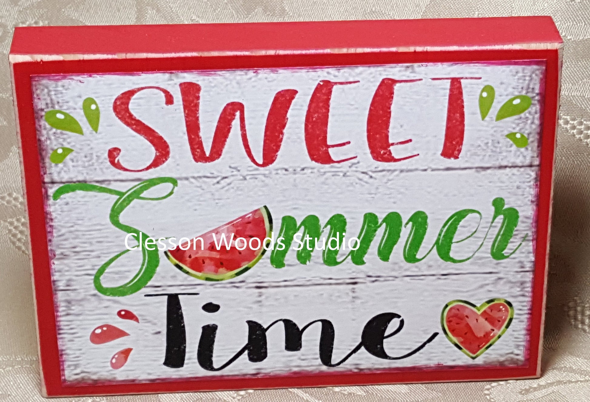Sweet Summer Time Watermelon Wood Sign comes in two sizes. Small is 5.5” x 4” and Large is 7.5” x 5.5”. I start with ¾” thick premium pine that I cut to size. I use high quality satin finish paint for exceptional results. The printed image is permanently applied to the painted surface. I shade around the image with matching paint to blend the image into the block for a quality décor piece you will be proud to display or give as a gift. The edges are sanded for a slightly worn look. With two sizes available these are great décor pieces for tiered trays, counter, shelf, table or desk.