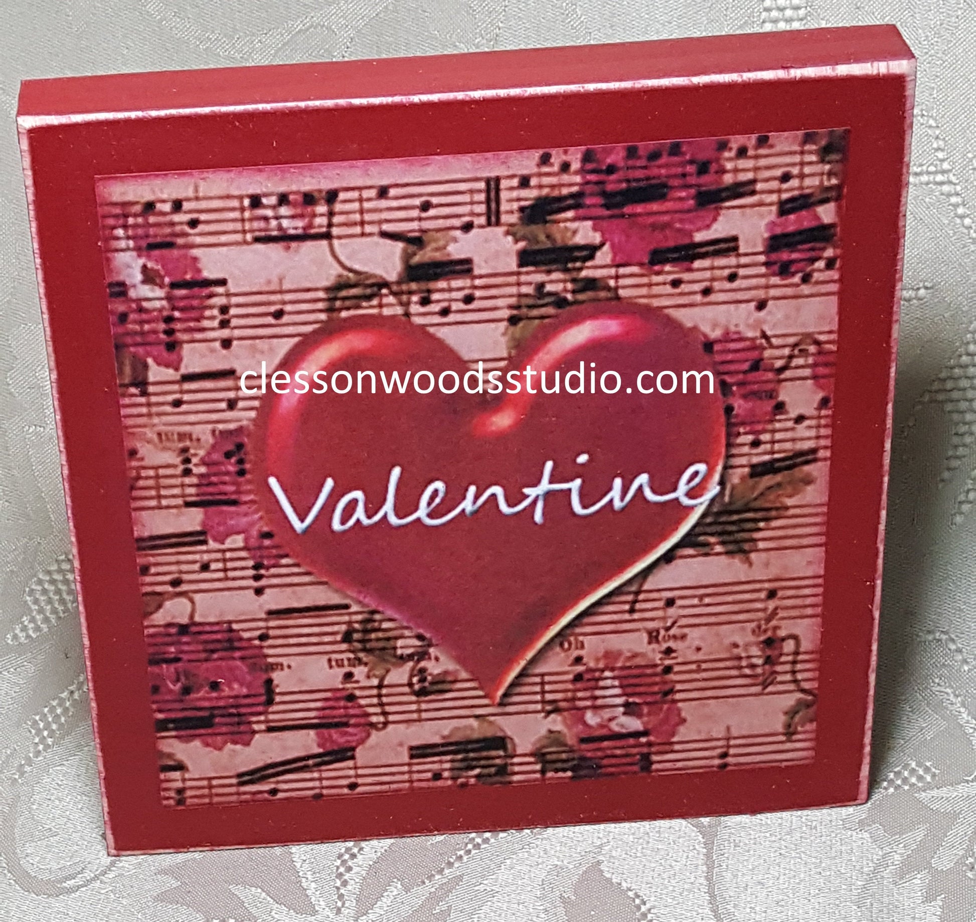 Valentine Heart on Sheet Music Red Wood Block Sign comes in two sizes. Small is 4.5” x 4.5” and Large is 5.5” x 5.5”. Both sizes are 3/4" thick. I use high quality satin finish paint for exceptional results. The printed image is permanently applied to the painted surface. I shade around the image with matching paint to blend the image into the block for a quality décor piece you will be proud to display or give as a gift. The edges are sanded for a slightly worn look. With two sizes available these are great décor pieces for tiered trays, counter, shelf, table or desk.