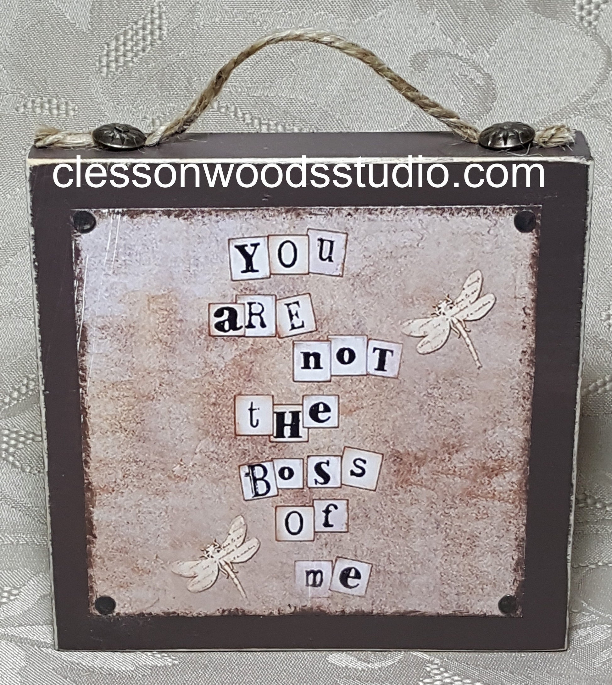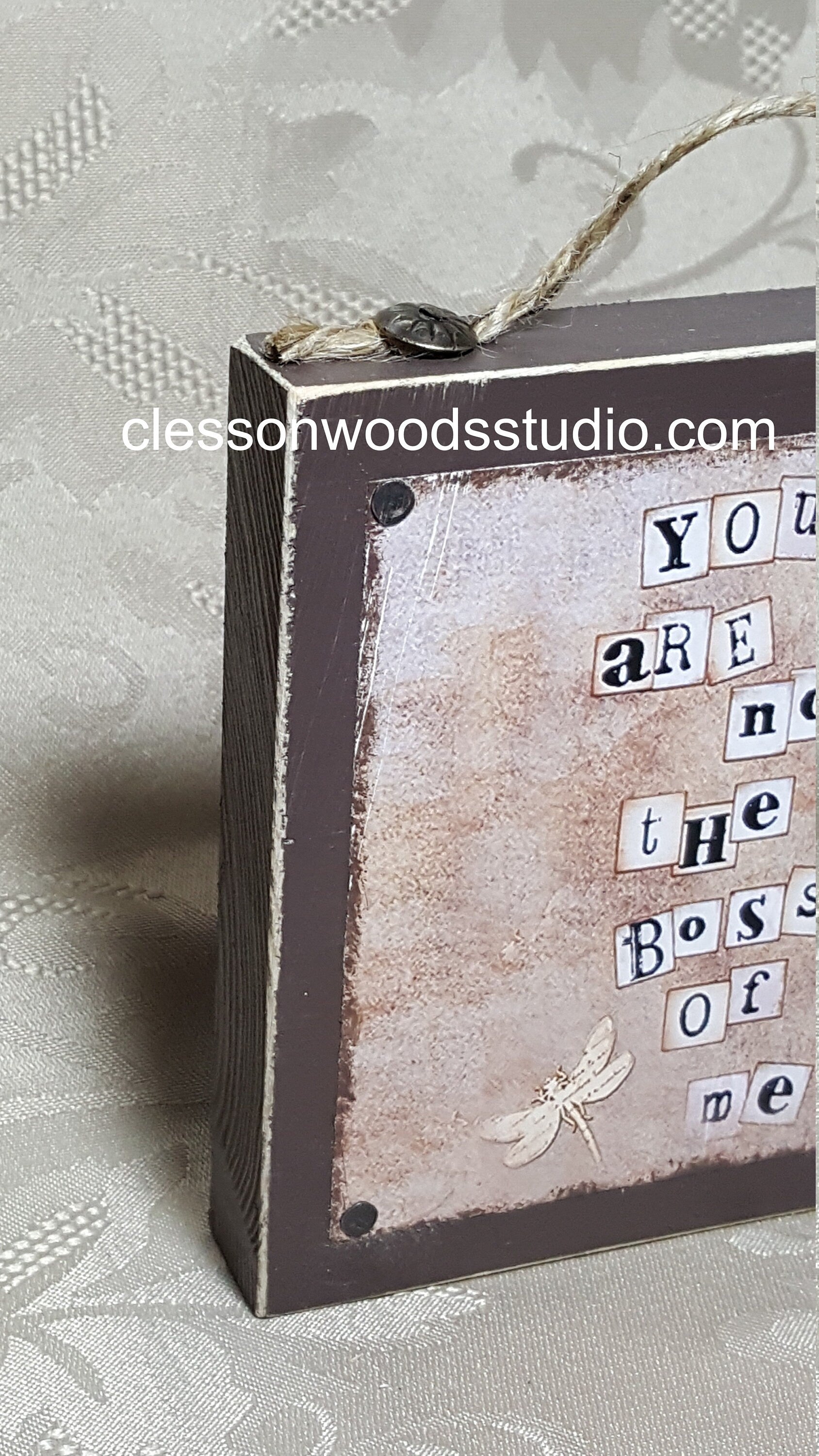 My square wood block shelf sitter is made from high quality 3/4" that I cut to size. All sides are painted a rich autumn brown with the edges hand sanded after for a slightly distressed look. The message is printed and permanently applied to the wood with the edges of the message blended into the block with matching paint. A jute handle is attached with decorative tacks.